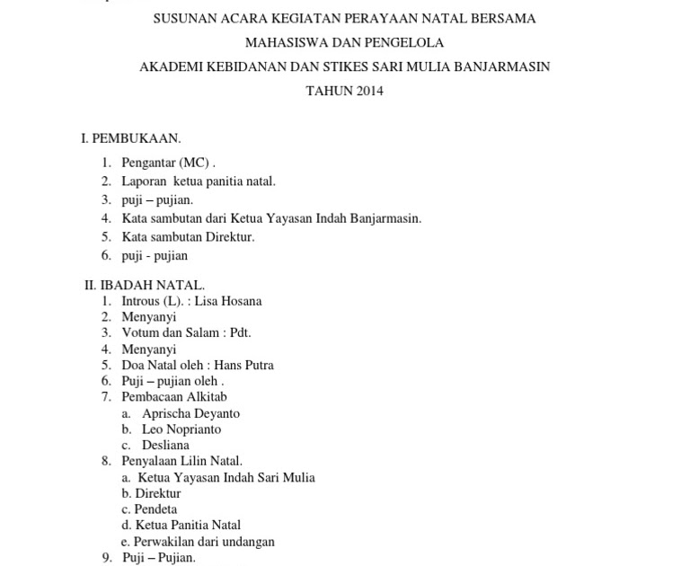 Contoh teks mc acara natal. Contoh teks mc acara natal. Kita harus bisa membuat acara lebih segar, tidak kaku. Contoh susunan acara natal pemuda doc document cute766. Contoh mc acara natal : Mc merupakan singkatan dari master of ceremony / pembawa acara. Temukan kata kata motivasi hidup terbaik untuk mencapai tujuan hidupmu dan sukses. Contoh mc formal acara seminar nasional!!!! Penjelasan lengkap seputar contoh teks mc formal dan non formal yang baik dan benar. Yang di belakang sana bisa mendengar suara saya? sambil menunjuk ke sudut kanan. Contoh kata sambutan acara natal. Akhir dari acara foto bersama. Klik pada judul artikel untuk memulai membaca.